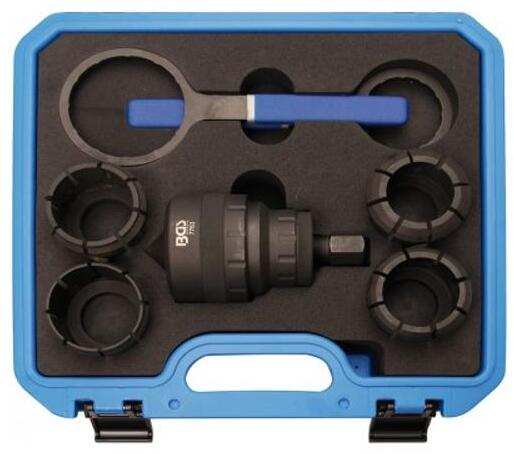 a belső csapágy eltávolításához a kerékagyból megfelelő a legtöbb járműhöz ahol a gyűrű átmérője 40-től 55 mm-ig pl. VAG BMW Ford Fiat Mercedes Opel Renault Seat Skoda Porsche Peugeot Volvo stb. beleértve a következő szerszámokat: 4 kihúzó 40-45 mm 45-51 mm 55-61 mm 50-55 mm méretekben 2 gyűrűs csavarkulcs orsó M20x1,5
