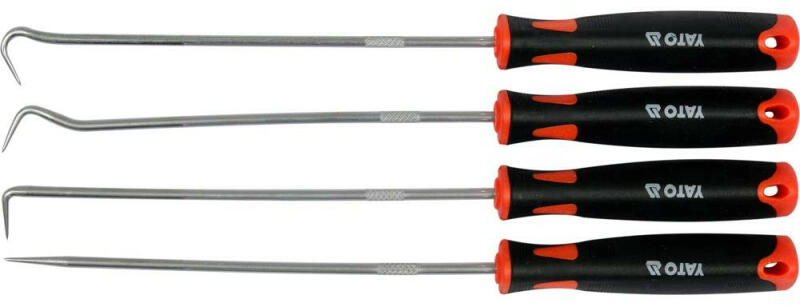 YATO YT-08429 Tömítéskiszedő kampó készlet Fogantyús horogkészlet. A horgok edzett és krómozott csúcsai 40 CR acélból készültek. A fogantyúk kétkomponensű anyagból készültek, ami megkönnyíti a szilárd fogást. Az ilyen típusú készleteket precíziós munkákhoz használják, például: aláásás fém-, fa- és műínyag alkkatrészek szétválasztása más szerszámok sz