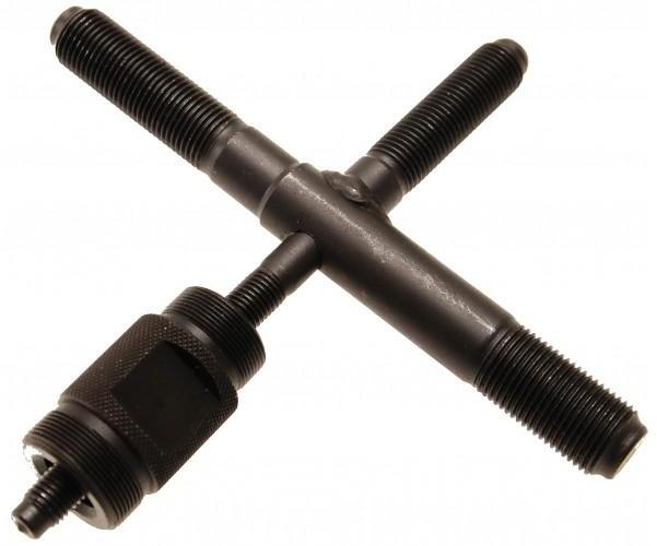 a forgórész csapágy lehúzásához alkalmas 5 különböző menetmérethez: M14 x 1,5 - M16 x 1,5 - M18 x 1,5 - M24 x 1,0 - M27 x 1,0 - M24 x 1,0 - M27 x 1,0 - 21 mm-es kivágással az ellentartáshoz méretei: 165 x 165 mm