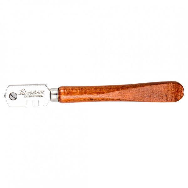 Üvegvágó, 6 korongos, fa nyelű A üvegvágó egyszerű „Silberschnitt" üvegvágó szerszám. Hat cserélhető vágókoronggal felszerelt, ez hosszú élettartamot biztosít a szerszámnak. A fa nyél jól fekszik a kézben, ennek köszönhetően kényelmesebb a vele végzett munka. A termék előnye még a vágás során igen hasznos, az üvegvágó fejében kialakított üvegtörő hornyok