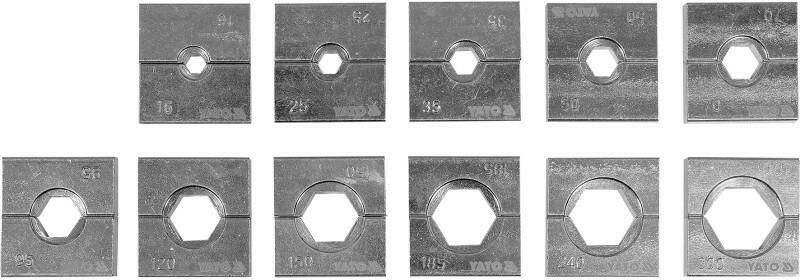 Terméktípus: Cserélhető szorítóelemek kézi, hidraulikus préshez Alkalmazás: Különböző méretű vezetékek végeinek és acélkötelek összepréselésére Préselési tartomány: Réz: 16-300 mm2 Alumínium: 16-240 mm2 Jellemzők: Cserélhető szorítóelemek Zárócsap Szorítószerkezet Kompatibilitás: YT-22862 kézi, hidraulikus prés