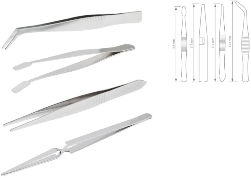 Handy Rozsdamentes acél csipesz szett csúszásmentesítő bordázással. Ajánljuk labormunkák, órás munkák, barkács, modellezés, bélyeg vagy ékszerészeti, elektronikai, szépségipari stb. célú felhasználásra. Tulajdonságok: Rozsdamentes acél Kényelmesen kialakított fogó rész Nem mágnesezhető Méretek: Lapos: 112 mm Szorító(önzáró): 117 mm Egyenes: 117 mm Hajlított: 1