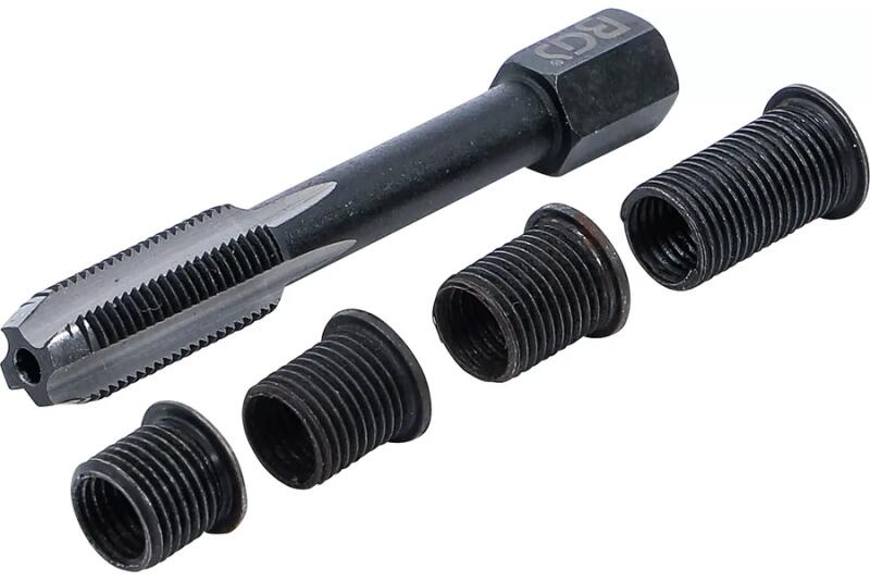 Ez a készlet ideális megoldás az izzítógyertyák meneteinek helyreállítására, és megkönnyíti a javítást, mivel minden szükséges eszközt tartalmaz. Alkalmas gyújtógyertyák menetének javítására M10 x 1,0 HSS csap, hossza: 65 mm, hatszöghajtás: 10 mm 4 db M8 x 1,0 menetes betét: 9,5 - 11,5 - 12,7 - 19 mm-es hosszban Bruttó súly: 116 g