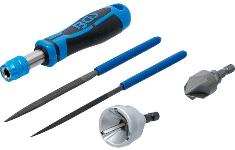 Termékadatok: Használható: Lyukak, Rudak (sima, menetes), Csövek, Stb. sorjázásához Alkalm as: Acél Réz Al umínium Kemény műanyag Illeszkedik: ø 3 - 19 mm között Max. fordulatszám: 400 fordulat/perc Tartalom: B első / külső sorjázó 1/4" hatszög befogású markolat 1 x félköríves reszelő 1 x Háromszögreszelő