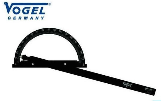 VOGEL Szögmérő, íves, 0-180° Egyszerű kivitelű íves szögmérő, 1°-os osztással. Edzett Dur-Alumínium, HRC63 Karcálló, eloxált fekete felület Rögzítőcsavar, rögzíthető szög Lézer-gravírozott skála 0°-180° Méretek: A félkörív méret: 80 mm ; szárhossz: 120 mm