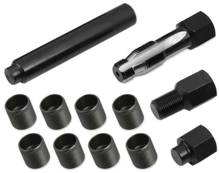 Gyújtógyertya menetjavító készlet. Autótípus: Ford Triton 1.9, 3.8, 4.6, 5.4, 6.8 literes motorralGyertyamenet: M14x1.25A készlet tartalma:- 1db menetfúró 6-lapos 19-es meghajtással (2 szélességi fokozattal). - 1db zömítő 6-lapos 19-es meghajtással- 1db