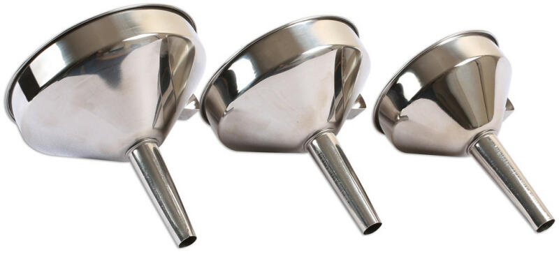 Rozsdamentes acél (INOX) kivitelű 3 darabos tölcsér készlet kivehető szűrőbetéttel. SS201 rozsdamentes acél alapanyag. Polírozott kivitel. Tölcsérek felső peremének átmérője: 100 mm / 120 mm / 140 mm Alsó, kifolyó kimeneti méret mindhárom tölcsérnél: átmérő 13 mm / hossz 72 mm Fogantyúval és szűrővel ellátva. Ideális a különböző felhasználásokhoz, beleértve