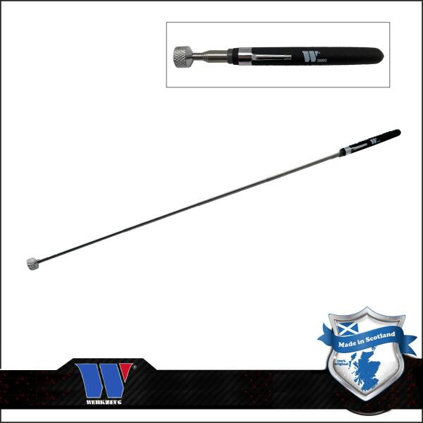 Welzh Werkzeug - Scotland Skót minőségű puha szivacs anyagú markolattal készített toll mágnes. A mágnesen levehető gumiborítás található. Tulajdonságok: - Puha ergonomikus szivacsos markolat képzéssel - Mágnes külső átmérője: 17 mm (gumiborítással együtt: 20 mm) - Hosszúság: 160 - 630 mm - Kapacitás: 3,6 kg - Mágnes végét gumi borítás védi. Csomagolási méret: 2