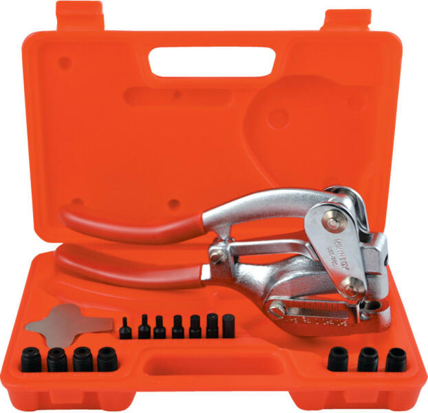 Alacsony erőkifejtéssel készíthetünk, szakíthatunk különböző átmérőjű lyukakat. Ajánlott acélokhoz, alumíniumhoz, műanyagokhoz és bőrökhöz. Állítható lemezvastagság és különböző átmérőjű matricák és lyukasztótüskék: 2.38, 3.18, 3.97, 4.76, 5.56, 6.35 és 7.14 mm Max. benyúlás: 45 mm Súly: 1.6 kg