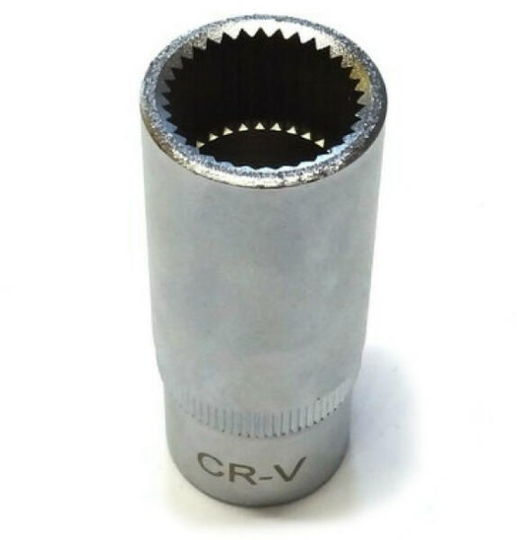 Diesel motorok üzemanyag befecskendező szivattyúja szelepfejének ki- és beszereléséhez kialakított speciális dugókulcs. Kompatibilis: Mercedes-Benz diesel személyautók (601, 602, 603, 605, 606, 615, 616, 617) Tulajdonságok: Meghajtás: 1/2" Speciális belső 33-fogú kivitel. Teljes hossz: 56 mm Külső átmérő: 24 mm Belső átmérő: 18 mm (33-fogú ricsnis résznél) Anyaga: Chro