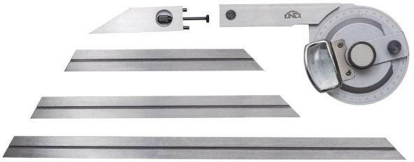 K-MET (KINEX) Univerzális szögmérő készlet, nagyítós Munkadarabok, készülékek szögeinek mérésére. Vonalzóként, derékszögként és szögellenőrzőként is használható. Nagyítós leolvasóablak Rozsdamentes acél, krómozott skála, polírozott felület Felbontás 5' (0° - 90° - 0°) Tartomány 4 x 90° 3 cserélhető mérősínnel 150 / 200 / 300 mm