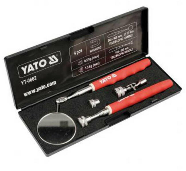 Yato teleszkópos mágnes és tükör készlet, 4 darabosMágnes átmérők: 13, 16, 20mmHosszúság: 160-620, 250-930mmEAN 5906083906626