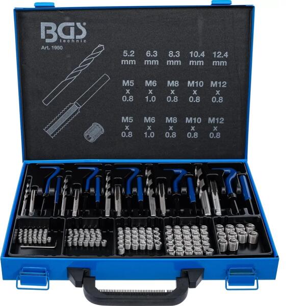 A BGS 130 részes menetjavítókészlet M5-M12 (BGS 1950) egy széleskörű eszközkészlet, amelyet a menetek javítására és készítésére terveztek. A készlet tartalmaz különböző méretű menetfúrókat és menetmetszőket, amelyek M5-től M12-ig terjednek. Specifikáció Alkalmazás: Menetek javítása és készítése különböző anyagokban Bruttó súly: 2420 g Készlet tartalma 5