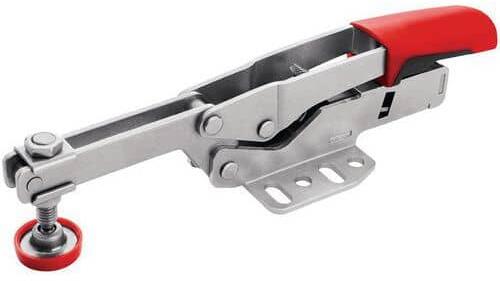 Függőleges csuklós bilincs nyitott karral és vízszintes szorítókarral. A szorítási magasság automatikus fokozatmentes állítása (35 mm-ig) szinte állandó szorítóerővel - a nyomócsavar beállítása nélkül. Állítható szorítóerő 2500 N-ig a kötésben lévő rögzítőcsavar beállításától függően. Kiváló minőségű, olajálló, kétkomponensű műanyag - csúszás