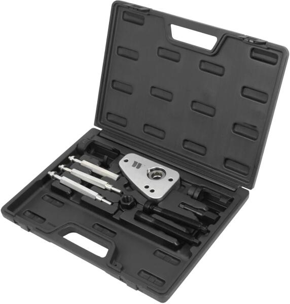 Bosch és Siemens HDI injektorok kiszereléséhez. Ezt a készletet használva nem kell eltávolítani a hengerfejeket. Alkalmas PSA 2.0l DW10/12 motorral szerelt járművekhez, amelyek a Toyota, Mazda és Hyundai modelleken is megtalálhatók. Tartozék:2 golyóscsapágyas lehúzó orsó, 2 nyitott aljzat az elektromos egység eltávolításához. Masszív tartókeret golyós csapágyakkal.