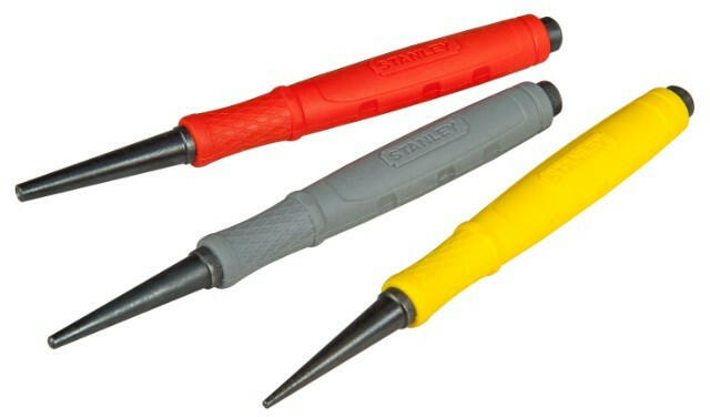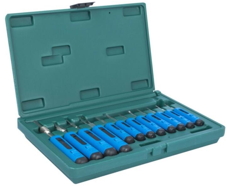 3 darabos edzett acél kiütő készlet 0,8; 1,6; 2,4 mm Hosszú kúpos csúcs a jó irányíthatóság érdekében Rugalmas nyél bevonat a biztosabb fogáshoz Három méret, színkóddal jelölve a jobb beazonosításhoz Hőkezelt acél
