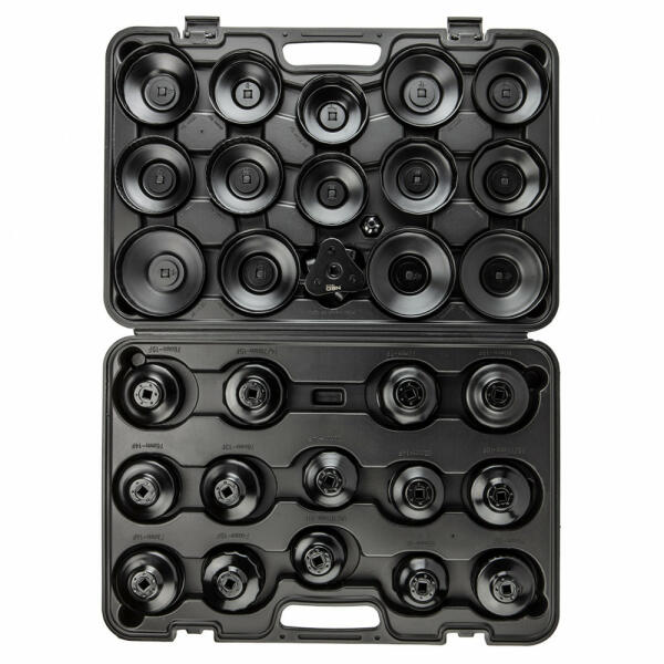 Dugókulcs készlet olajszűrőhöz: 3 karos állítható 3/8" racsnis kulcs, 3/8" - 1/2" adapter, dugókulcsok: 6-pontos: 66 mm, 8-pontos: 76 mm, 10 pontos: 92 mm, 12 pontos: 76 mm, 14 pontos: 65 | 66 | 67 | 68 | 73 | 76 mm, 15 pontos: 74 | 75 | 77 | 78 | 80 | 82 | 90 | 93 | 95 | 100 | 106 | 108 mm, 16 pontos: 86 mm, 18 pontos: 86 | 96 mm, 30 pontos: 76 mm, 36 pontos: 93 mm, 45 pontos: 93 mm
