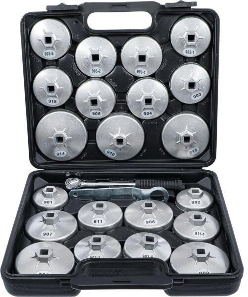 A készlet tartalma Racsnis kulcs, 12,5 mm-es kihajtófej (1/2") Csillagkulcs 27 mm Olajszűrő sapka, belső 12,5 mm (1/2") | 14-szögletű Ø 65 mm Olajszűrő sapka, belső 12,5 mm (1/2") | 14-szögletű Ø 67 mm Olajszűrő sapka, belső 12,5 mm (1/2") | 14-szögletű Ø 74 mm Olajszűrő sapka, belső 12,5 mm (1/2") | 15-szögletű Ø 75 mm Olajszűrő sapka, belső 12,5 mm (1/2") | 8-szögle