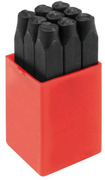9 darabos digitális számbélyegző készlet Magasság: 66 mm Szélesség: 8 mm Anyag: 1045 szénacél Keménység: 50-55 HRC Számjegy magassága: 6 mm Használat: Fém és bizonyos műanyag felületek tartós mechanikus jelölésére Tartalom: 9 darab számjelölő (0, 1, 2, 3, 4, 5, 6, 7, 8)