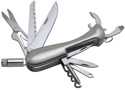 Méretek csukott állapotban: 9 x 2,6 x 2 cm Pengék anyaga: rozsdamentes acél Nyél anyaga: matt alumínium Funkciók száma: 12 Akkumulátor típusa: 4x LR621 /(1,5V) mellékelve A készülék funkciói: kés;dugóhúzó, körömreszelő, palacknyitó, dugóhúzó, konzervnyitó, olló, Phillips csavarhúzó, lyukasztó