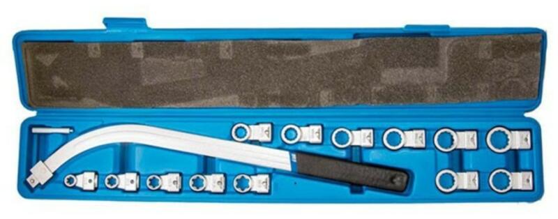 univerzális ékszíj, ékszíjtárcsa feszítő, szerelő készlet ékszíjakhoz, és vezérműszíjakhoz, 15 darabos. A készlet tartalma:- 8db 12-lapos csillag-fej; méret: 12, 13, 14, 15, 16, 17, 18, 19mm- 6db E-típusú belső torx fej; méret: E-10, 12, 14, 16, 18- 1db kinyomó- 1db hosszú, lapos, C-hajlított hajtókar csúszásmentes gumírozott markolattal