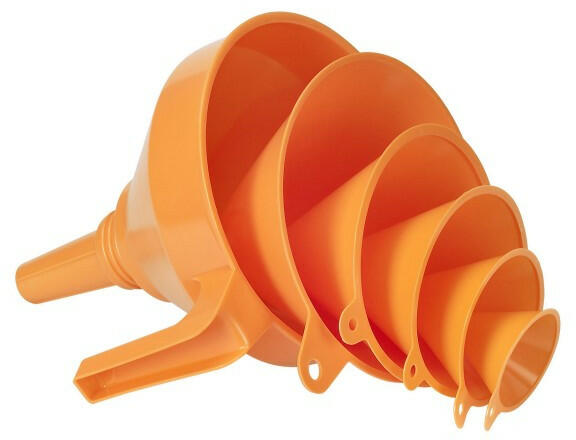 Tölcsérkészlet Polietilénből, Ø 50-75-100-120-150-160 mm Tartalom:0,05–0,09–0,25–0,27– 0,7–1,2 lit. Anyag HDPE (nagysűrűségű polietilén). Szín narancs. Magasság 205mm. Alapterület HxSZ 200x160mm. Súly 0,25kg. Fogantyú a kényelmes használathoz. EAN kóddal. A 160 mm Ø t ölcsér kivehető réz szitával. Olaj-, sav- és üzemanyagálló. Sokoldalú alkalmazási lehetős