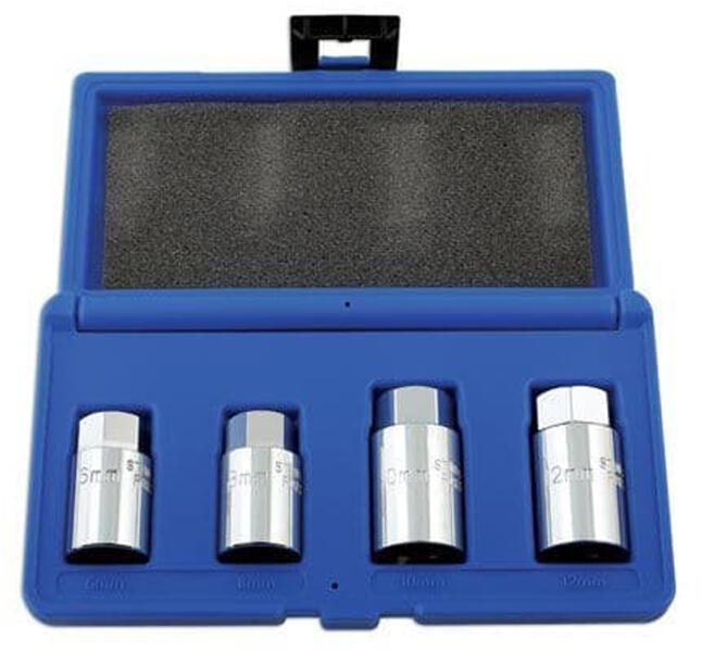 Laser Tools - UK Tőcsavar kiszedő 4 db-os készlet M6-M8-M10-M12-es méretekben praktikus műanyag tároló dobozban. Jellemzők: - Rövid kivitel a szűk helyeken történő munkavégzésnél is ideális - Bal és jobb menetekhez egyaránt használható - Méretek: - 6 mm , 8 mm - 3/8"-os csatlakozással - 10 mm , 12 mm - 1/2"-os csdatlakozással - Koncentrikus működés a 3 db megfogó görg