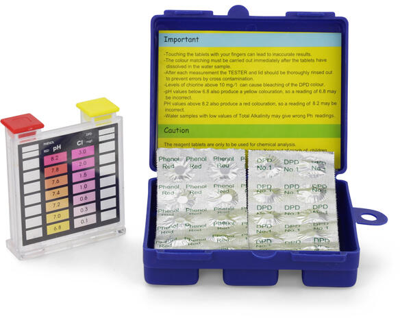 PurePool medence tablettás vízelemző készlet 2in1 Segítségével megmérhetjük a medencénk klór és pH értékét. A csomag tartalma: 10 db tabletta klór méréshez 10 db tabletta pH méréshez Teszter tégely Műanyag tároló pH mérési tartomány: 6.8 - 8.2 Klór mérési tartomány: 0.1 - 3.0
