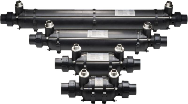 D-KWT-VA Plastic hőcserélő Polipropilén házba szerelt rozsdamentes bordázott (VA típus) vagy titán (Ti típus) csőspirállal, magas korrózió állósággal úszómedencékhez. Sós vizes medencéhez a titán csőregiszteres hőcserélő használható. TULAJDONSÁGAI - Hollanderes ragasztható csatlakozás D50mm - Rögzítéshez a polipropilén bilincs tartozék - Max. nyomás fűtési ol