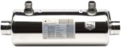 D-HWT hőcserélő Készre szerelt, kompakt PP házas, bordázott rozsdamentes (VA típus) vagy titán (TI típus)csőspirálos nagy hatékonyságú hőcserélő. Medencék, pezsgőfürdők, fürdőtavak fűtésére. Víz/víz hőcserélő, sima, keresztáramú tekercselt csővel, korszerű hegesztéssel és kiváló minőségű megmunkálással. A készülék hosszú élettartamát az anyag fest