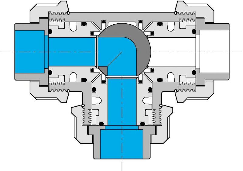 PVC golyós háromutas szelep; csatlakozás - ragasztás; szín - szürke.