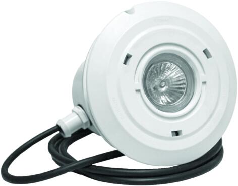 Reflektor MINI2008 "Mini 2008" víz alatti világítás betonos medencéhez, Hőálló (ABS) műanyag test, fej fehér műanyagból, alsó kivezetéssel. Minőségi kialakítása kiváló fényerőt és élettartamot biztosít. 2 méteres kábellel kapható. 50 W / 12 V halogén izzóval.