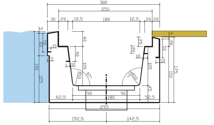 A beton túlfolyó csatorna fóliázott medencékhez készült, vízelvezető rendszer.