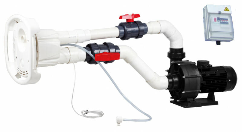 Több funkciós, falba építhető ellenáramoltató, minden medencetípushoz- rozsdamentes acél kapaszkodóval és két befúvóval, amelyeken az áramlási sebesség szabályozható.