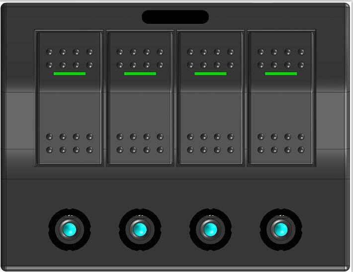 Termék részletekEgyedi formavilágú, 4 egységes kapcsolótábla automata biztosítékkal. 12V/24V. PCB (NYÁK) és LED visszajelzésű elegáns, modern megjelenésű kapcsoló tábla. Nyomógombos megszakítók. IP68 vízállóság. 1 x (ON)-OFF, 3 x ON-OFF kapcsolókAmper: 2 x 5A / 1 x 10A / 1 x 15AMérete: 130 x 100 mmKivágási méret: 107 x 82 mm