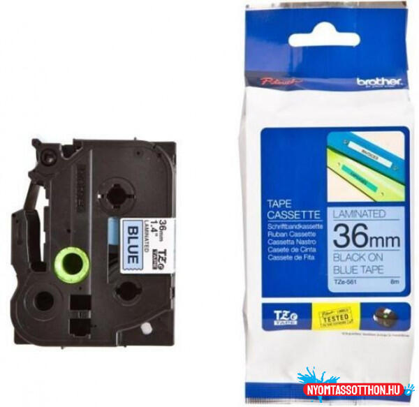 Brother TZe-561 36 mm széles 8 m hosszú szalagkazetta **TZe -551 öntapadós laminált címkeszalag tartós feliratok nyomtatásához. ** * Szalag típusa: Standard laminált * Szalag szélessége: 36 mm * Szalag hossza: 8 m * Szalag színe: Kék * Felirat színe: Fekete