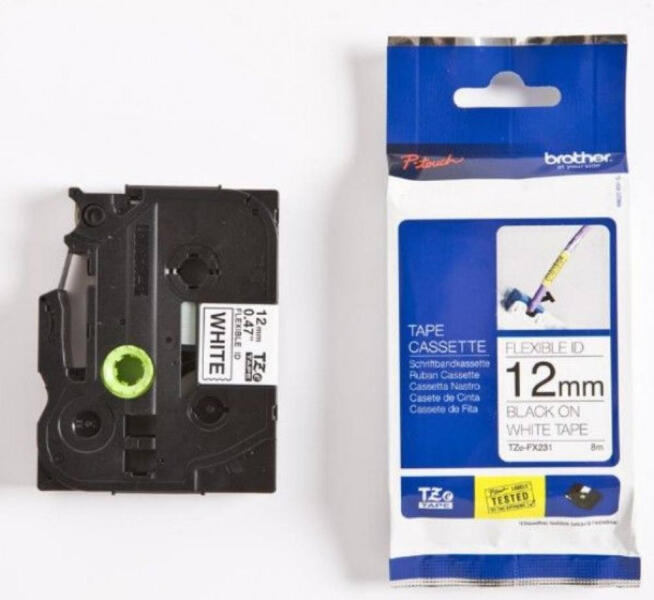 Brother TZeFX231 szalagkazetta (Eredeti) Ptouch 12 mm széles, 8 m hosszú, fehér alapon fekete betűs, flexibilis címkeszalag laminált feliratok nyomtatásához. Kábelek jelölésére ajánlott.