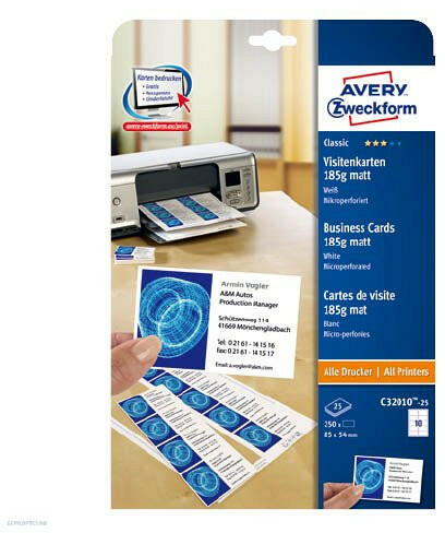 Magas minőségű névjegykártyák finom mikroperforációval. A termékek FSC® minősítésűek: felelős erdőgazdálkodású erdőből származó papírból készültek. Univerzális minőségben minden hagyományos nyomtatóhoz. Mindkét oldalán nyomtatható - további információk hátoldali feltüntetéséhez. Tartalom: 250 kártya / 25 oldal .