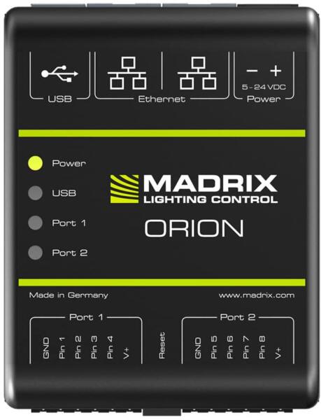 Powerful A/D converter MADRIX ORION is a powerful A/D converter It converts any analog input signal (0 to 12 V) into a digital DMX output signal (8 bit or 16 bit) Supports a wide range of compatible sensors, potentiometers, switches, and triggers Allows you to easily create interactive projects using sensors for light, temperature, PIR, and many more Acts as a brigde between such equipment and a r