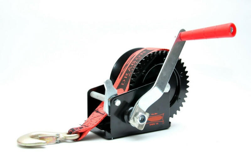 720 kg (1600 lbs) teherbírású kézi csörlő hevederrel. Heveder hossza: 10 méter