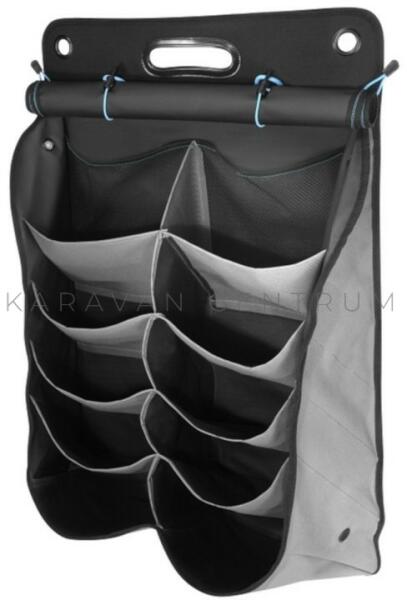 Szellőzőnyílásokkal ellátott cipzáras fali cipőtartó 10 zsebbel, praktikus fogantyúval Méret: 50 x 80 cm Thule tartók tulajdonságai: kiváló minőségű és tartós anyag stílusos fekete-szürke szín kék árnyalatokkal minőségi varrás hosszú távú használatra ergonomikus cipzárak kiegészítő rögzítések palackokhoz extra hálók könyvekhez és újságokhoz különböző