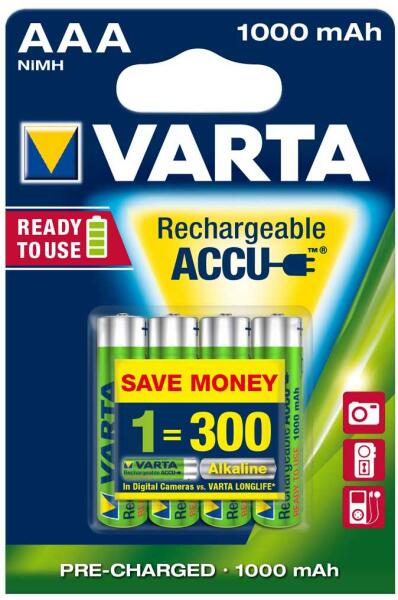 Varta AAA 1000mAh 4db Ready to Use tölthetõ elem, akkumulátor Feszültség: 1,2 V Kapacitás: 1000 mAh Technológia: Ni-MH