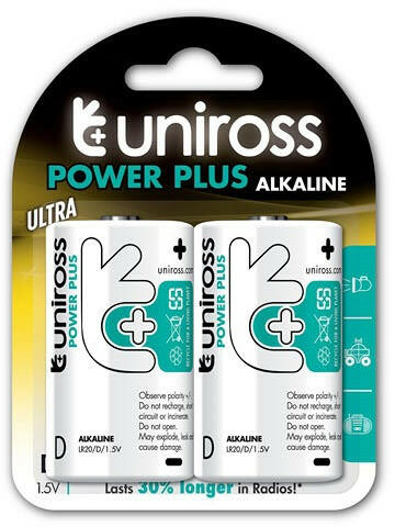 Tartós elem Uniross Alkaline Power D góliát 1.5V alkáli 2 db-os alkáli/tartós elem feszültség: 1,5V cella mérete: D kiszerelés: 2 db/ csomag