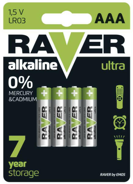 EMOS Raver Ultra elemek jellemzői: kis fogyasztású, hosszú élettartamú készülékekhez a legjobb a hagyományos szén-cink elemeknél akár 7× több energia működési hőmérséklet: -20 °C és +60 °C között akár 7 évig is tárolható Tulajdonságok: Értékesítési csomagolás: 4 db, bliszter Méretek: 10,5 × 44,5 mm Súly: 11,5 g Akkumulátor mérete: AAA Feszültség: 1,5 V Ka