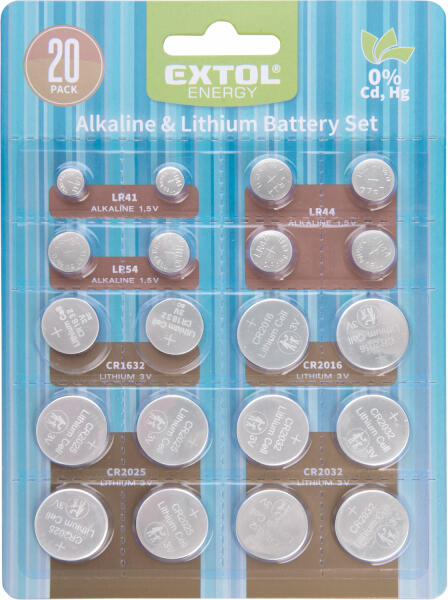 2× LR41, 1,5V alkáli 2× LR54 (LR1130), 1,5V alkáli 4× LR44, 1,5V alkáli 2× CR1632, 3V Lítium 2× CR2016, 3V Lítium 4× CR2025, 3V Lítium 4× CR2032, 3V Lítium