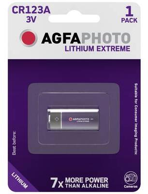 Lítium CR 123 A fotoelem, Agfa Digitális és analóg kamerák számára Csekély önkisülés Nagyteljesítmény A nagyteljesítményű CR 123 A elem a digitális és analóg kamerák számára különösen nagy teljesítményt nyújt, csekély önkisülés mellett. Kiváló állandó feszültség leadás jellemzi még alacsony hőmérsékleteken is (-40°C-ig), valamint nagyon megbízható és