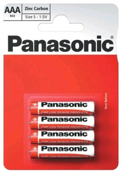 Panasonic RedZinc R03RZ/4BP AAA/mikro cink-mangán tartós elem 4 db/csomag A Panasonic cink-szén elemek a kisfogyasztású készülékek gazdaságos áramforrásai. Szivárgásvédelem: Speciális kialakítású tömítés, mely megakadályozza a szivárgást a szénrúdnál és a cinktokozásnál. A belső cső a cinktokozás kifutása miatti szivárgást gátolja meg. Az erős, fémes külső