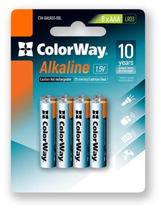 COLORWAY AAA alkáli elem, (8 darab) Alkaline batteries ColorWay are a universal solution for most electronic devices for daily use; They work up to 10 times longer than ordinary salt batteries; They are distinguished by low cost, durability, and high capacity, they work even at low temperatures; Such batteries will be the best option for use in devices with medium and high energy consumption and