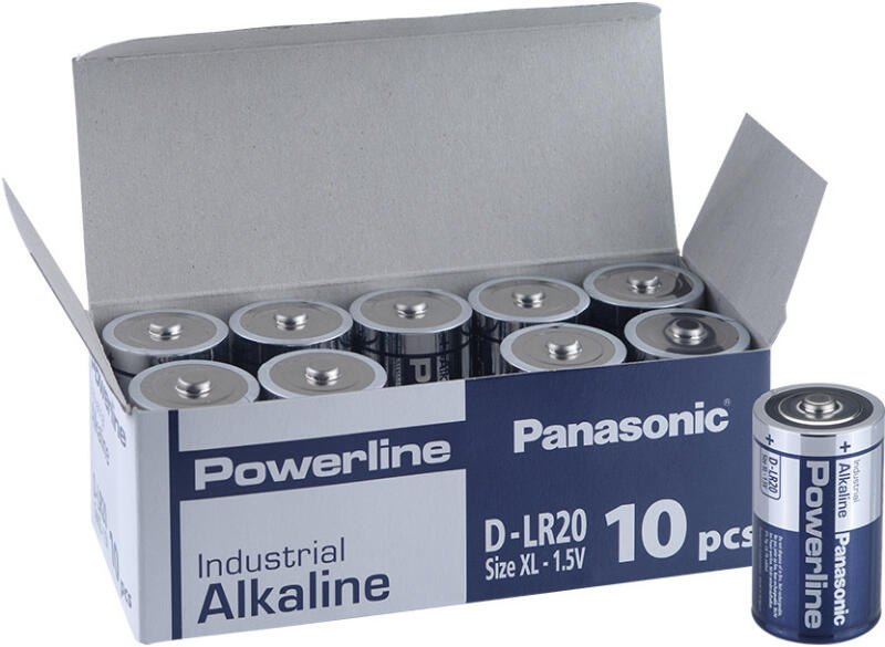 Panasonic Powerline D LR20AD alkáli góliátelem professzionális, ipari felhasználásra, 10 db-os kiszerelésben. A Panasonic Powerline alkáli elemsorozat sokoldalúan felhasználható, de elsősorban nagy energiafogyasztású és nehéz körülmények között végzett munkákhoz szánt eszközökhöz tervezett termékcsalád. Az alkáli elemek ipari változata megegyezik a buborékfóliában
