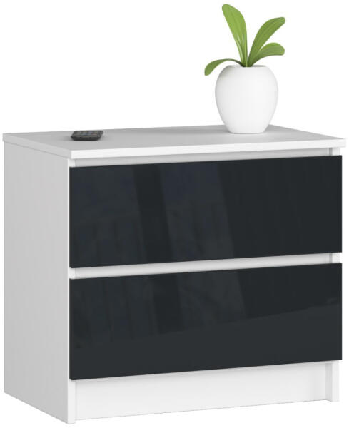 Modern, kétfiókos komód fehér korpusszal és magasfényű grafit frontokkal. Kiváló minőségű, 16 mm-es kopásálló laminált lapból készült, ABS élzárással a maximális tartósságért. Elegáns tárolási megoldás modern otthonokbaEz a kompakt méretű komód tökéletes választás azoknak, akik stílusos és praktikus tárolási megoldást keresnek. A fehér korpusz és a magas